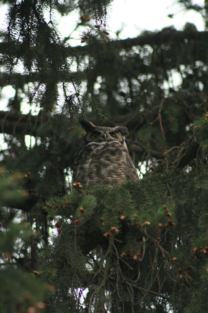 This horned owl is in the yard next door. They look so regal and their babies look like cartoons. We'll try to get a photo but the parents like to hide them and I don't like to wait for them when it's raining.